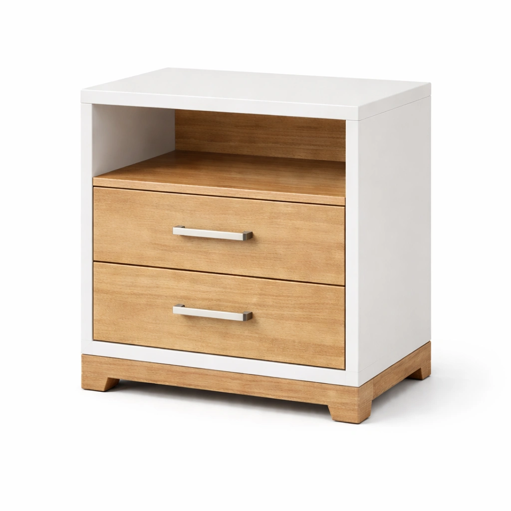 Comodino in legno con cassetti e ripiano bianco naturale