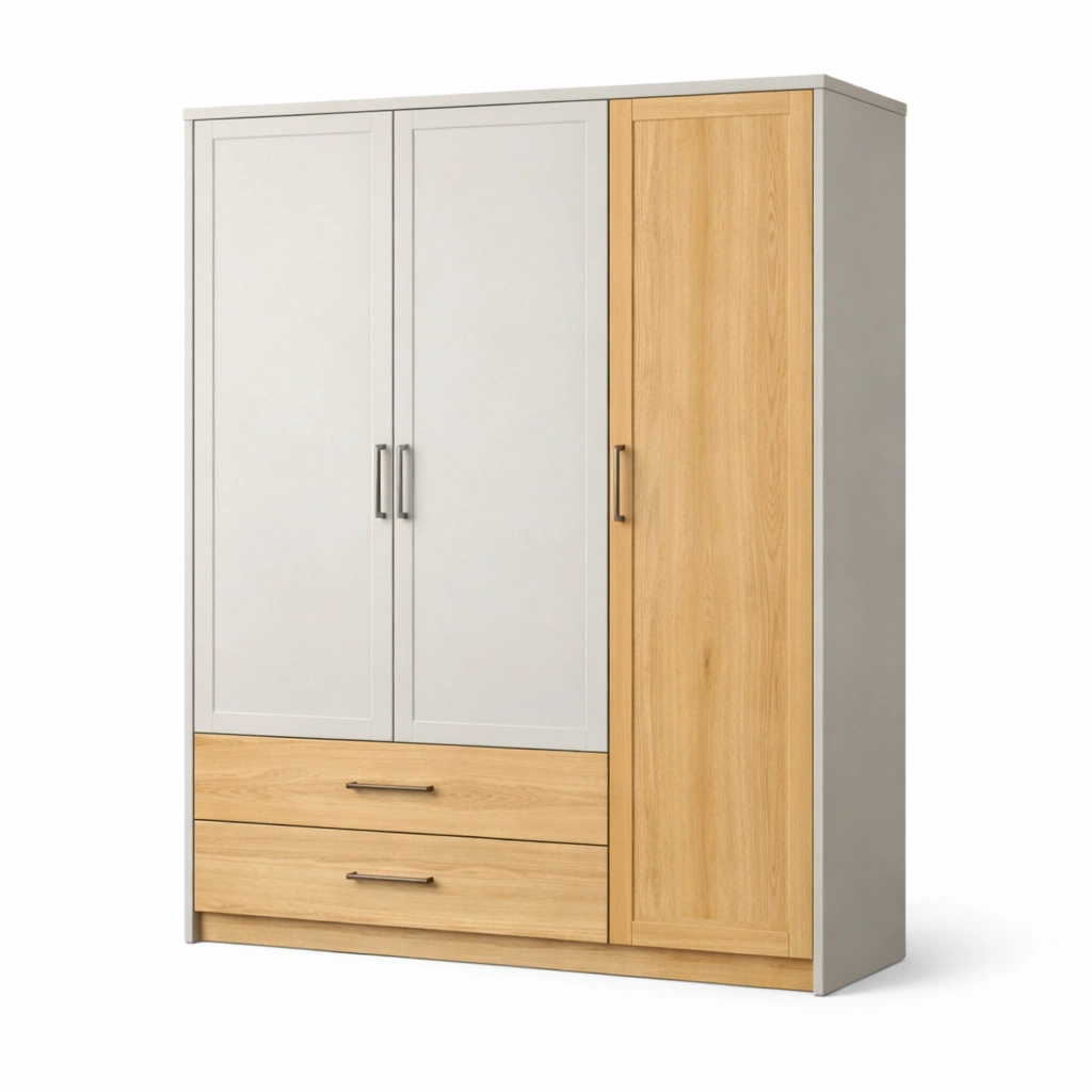 3 porte, 2 cassetti, 2 ripiani interni, 1 barra appendiabiti.