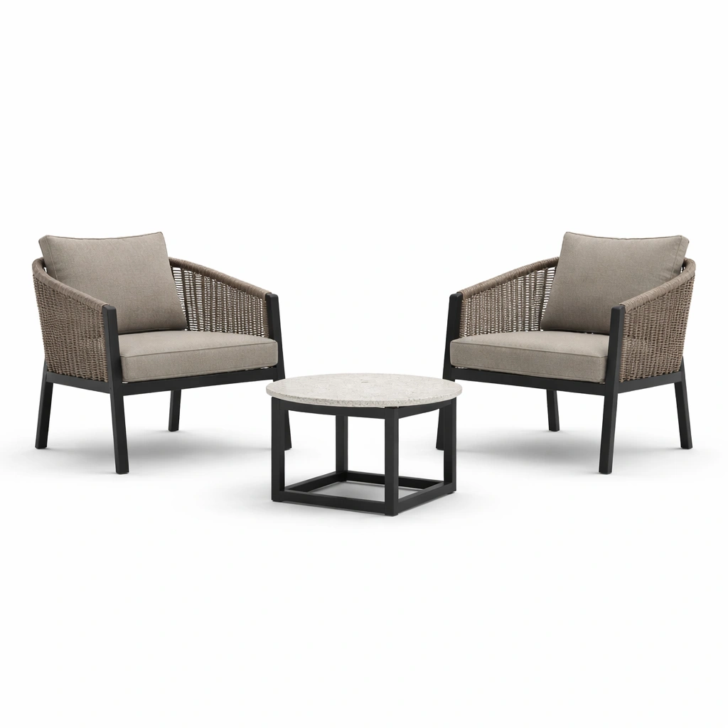 Dimensioni: Tavolino Ø60xH40 cm, Poltrona 75x70x78 cm.
